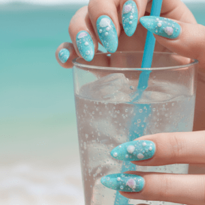 This captivating image unveils a hyperrealistic close-up of ‘Jelly Ocean Nails,’ a truly unique and enchanting manicure that transforms each fingertip into a mesmerizing miniature aquatic realm. The…