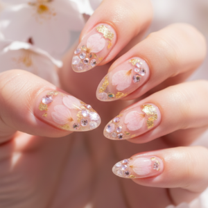 This breathtaking macro photograph captures the exquisite beauty of ‘Sakura Petal Prism Nails,’ a stunning masterpiece of nail art that transforms fingertips into delicate works of wearable art….