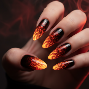 This captivating digital artwork masterfully brings to life the concept of ‘Lava Chrome Nails’ with an astonishing level of detail and artistic flair. The image presents a striking…