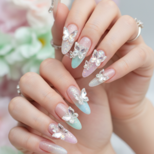 Dive into a realm of delicate beauty with this exquisite ‘Whispering Wings: Pastel Crystal Nail Art,’ a mesmerizing close-up capturing a fantasy-inspired manicure designed for the modern romantic….