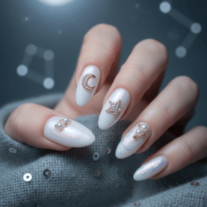 This captivating image showcases an exquisite set of ‘Moonlight Pearl Nails,’ a true masterpiece of celestial-inspired nail art. The primary focus is on a hand, elegantly posed to…