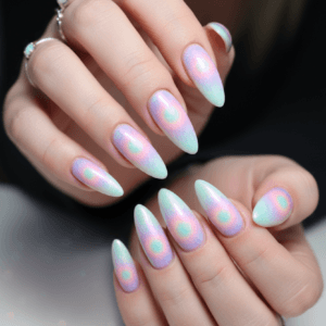 A breathtaking close-up captures the enchanting beauty of ‘Aura Nails,’ a masterpiece of iridescent artistry that transcends conventional manicures. Each perfectly shaped nail is a tiny canvas, radiating…