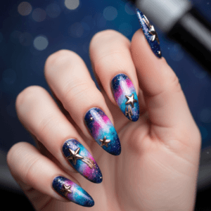 This captivating artwork showcases an exquisite close-up of “Star Charm Nails,” a manicure that transcends ordinary nail art to become a miniature celestial masterpiece. Each nail is a…