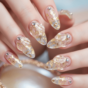 This ultra-realistic, hyper-detailed macro photograph captures the breathtaking artistry of ‘Crystal Bloom Nails,’ a manicure that transcends traditional beauty into a realm of sculpted luxury. The almond-shaped nails…